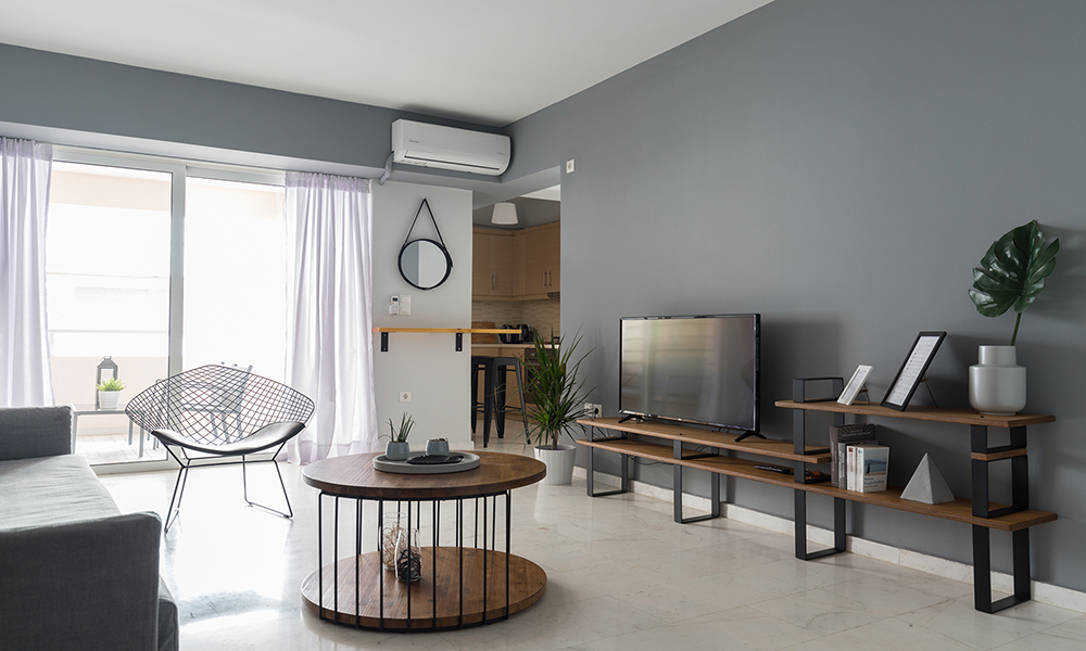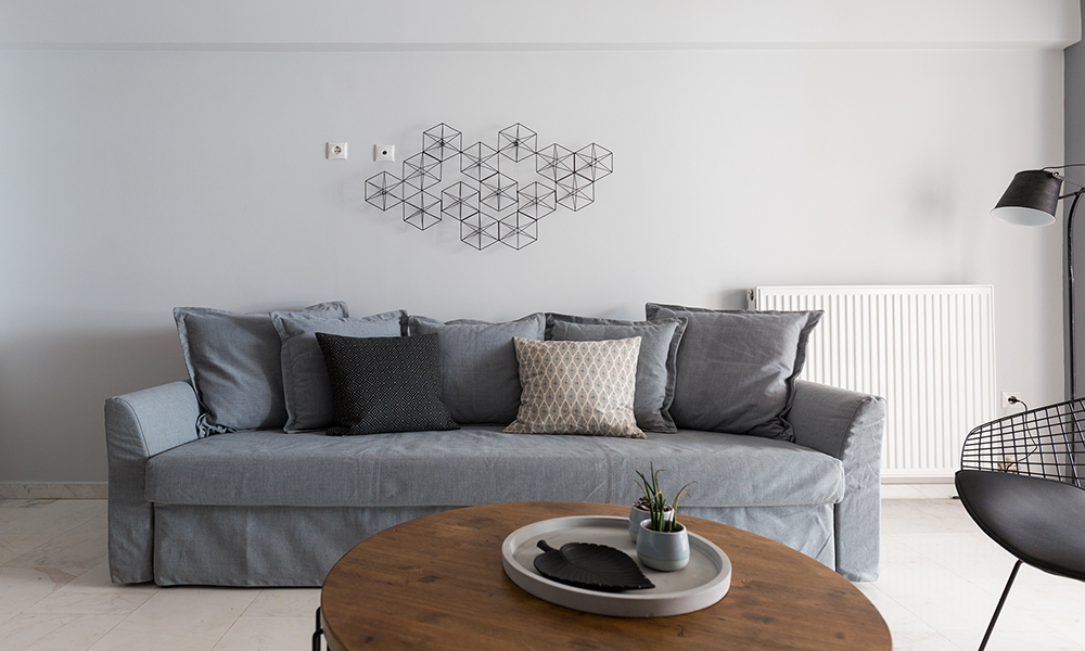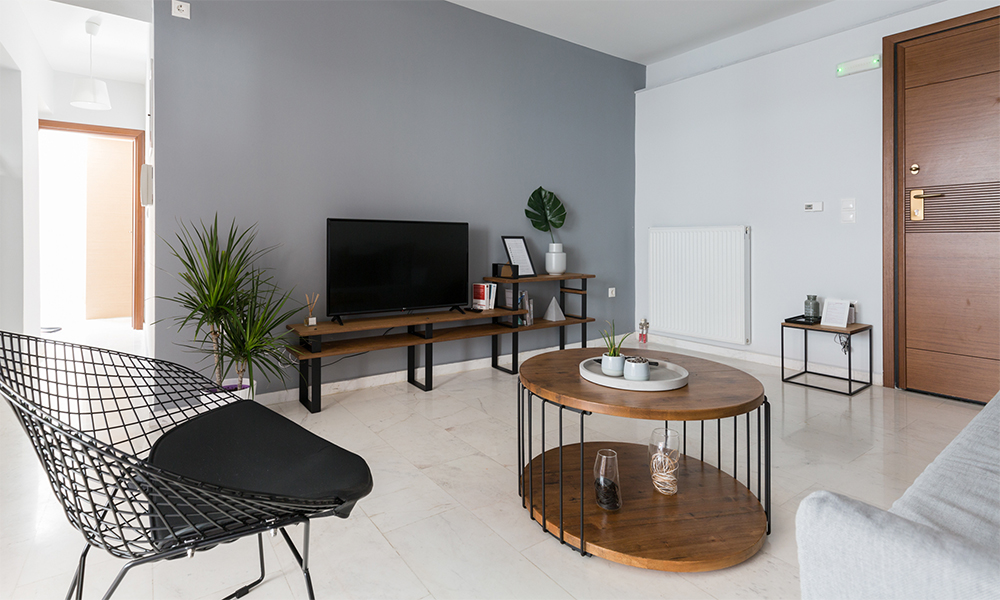 The project’s objective is the interior designing of an one bedroom apartment. Clean, crisp lines, a simple colour palette and materials that include black metal, wood and grey textile were used for the furnishing and decoration of the living room and the bedroom of the apartment.