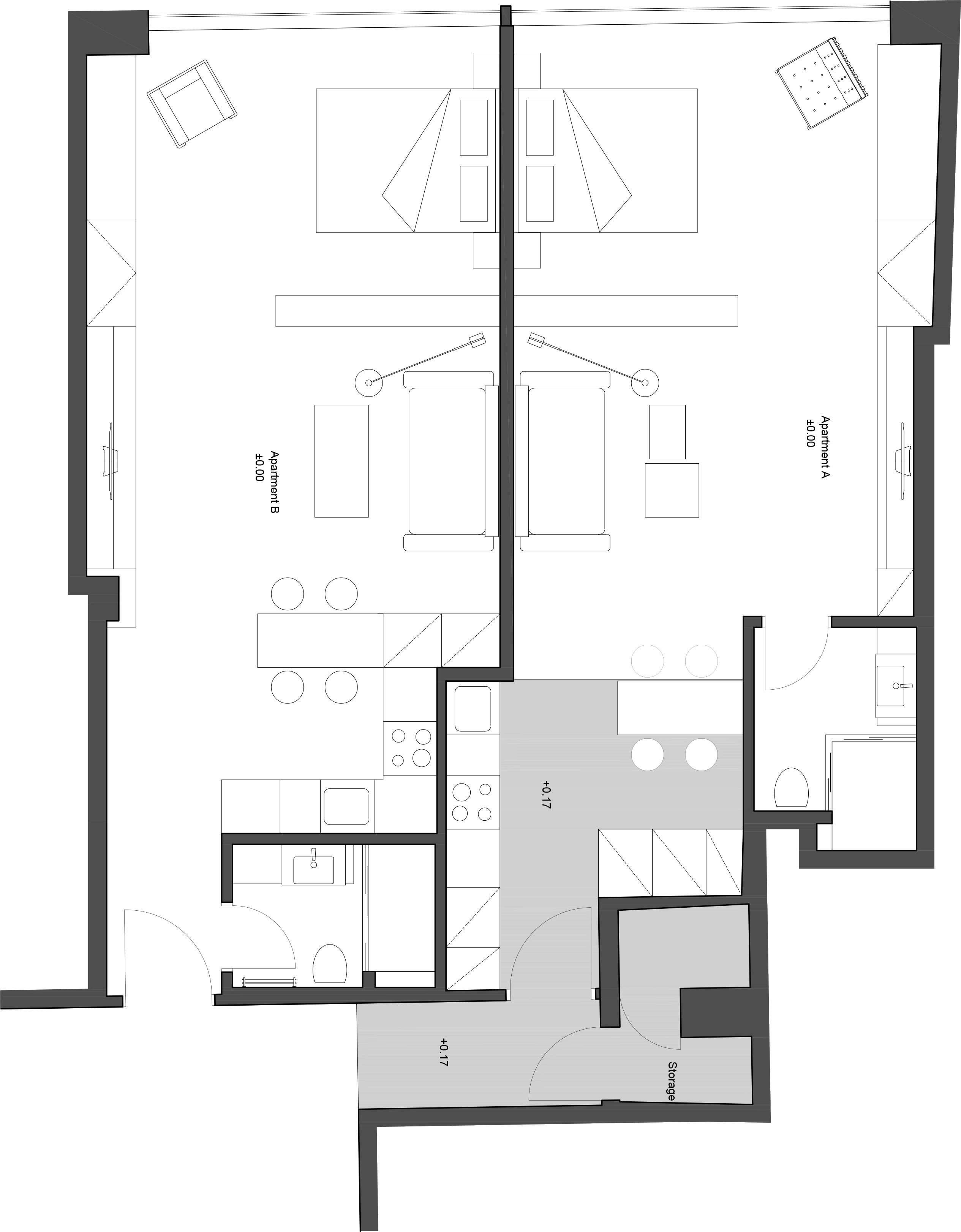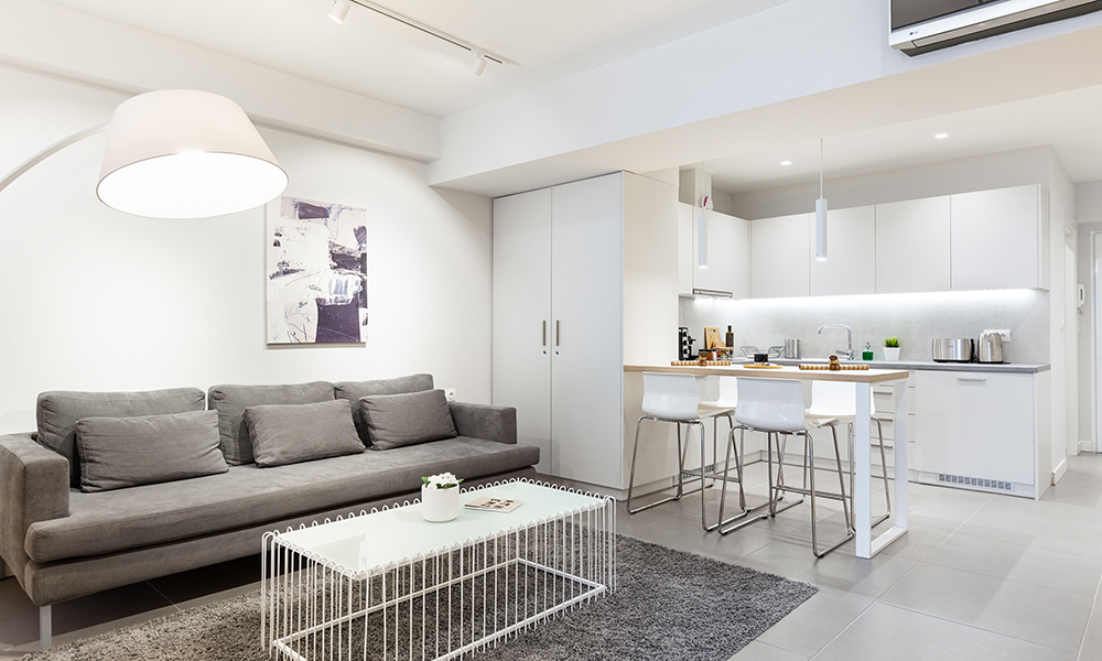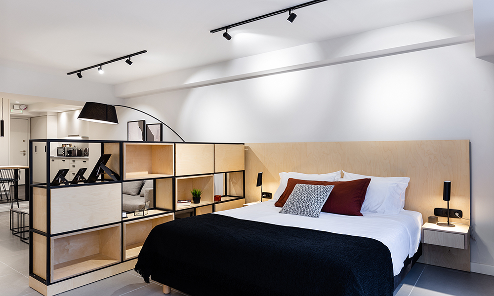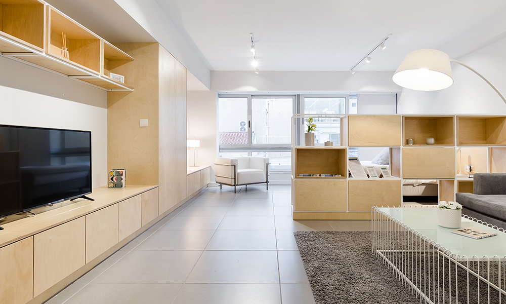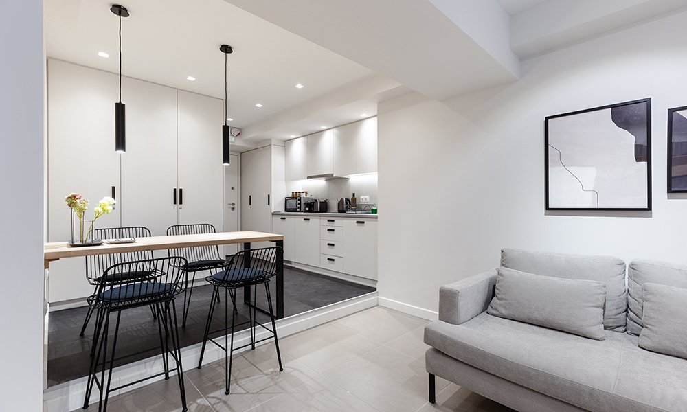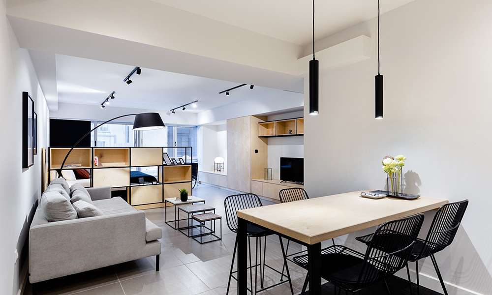 The project’s objective is the transformation of an office space to two separate apartments (White apartment and black apartment respectively). The two apartments are located in Ermou street, central Athens, and will be both used for short term and long term rentals. The apartments were designed in similar way. The aim was to combine most in-house facilities in a single room, keeping an open space mindset. To that end a uniform wooden multipurpose piece of furniture was constructed, running the full length of one of the apartment’s walls. At the same time, the creation of a low-height library with “see-through” elements defines the separation of lounge and sleeping spaces, without, however, preventing visual communication. Natural colored plywood surfaces are dominant. These surfaces are combined with metallic elements in black and white. Design of the wooden constructions offered a unique opportunity for architectural experimentation. Neutral textures and colors were chosen for both the kitchens and the bathrooms so as to create a proper foundation for bringing out these wooden constructions.
